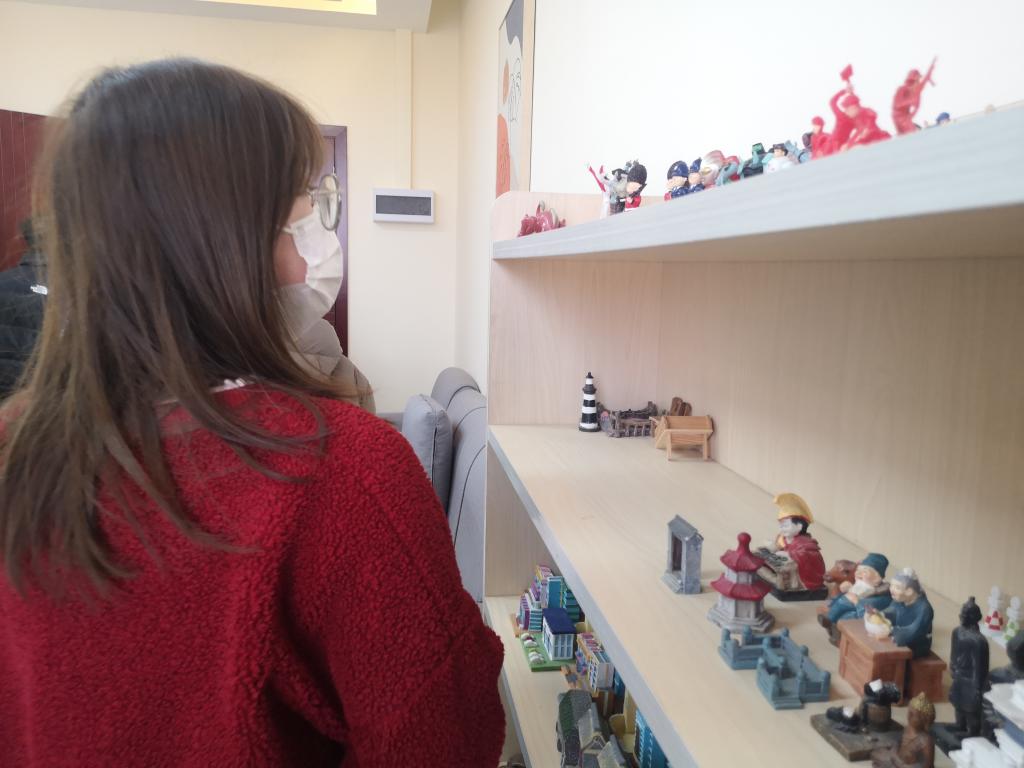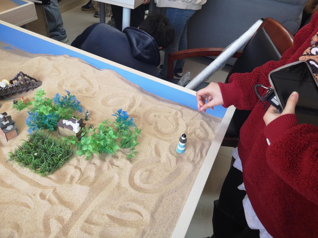 随后,肖老师带领大家参观了大学生心理健康教育中心。“大学生心理健康教育中心除了有诸多心理辅导室外,还有不少的功能室。”肖老师带着大家边走边介绍道,“心理沙盘是通过同学们对沙盘道具的选择及摆放来反映心理状态。音乐放松室内提供音乐放松设备及放松音乐和电影,帮助同学们调节负面情绪,改善睡眠状况。心理宣泄室则提供宣泄器材,帮助同学们平衡压力,将消极能量转化为积极能量。最后是星空花园,依据园艺疗法的原理,利用植物来帮助同学们缓解压力。”