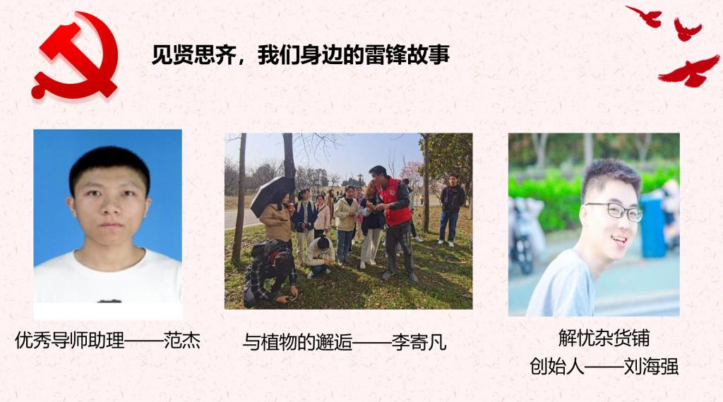 王胜娟表示,前有新时期的道德模范——最美奋斗者郭明义,把践行雷锋精神作为自己的人生选择,现有51吃瓜网 学子学雷锋,树新风,见行动。如优秀导师助理范杰,他主动思考、承担与积极行动,把雷锋精神融入日常的工作生活,在自己岗位上做一颗永不生锈的螺丝钉;与植物的邂逅科普讲解志愿者李寄凡,他默默无闻、脚踏实地,用充足的知识储备及通俗易懂的讲解践行雷锋精神;解忧杂货铺创始人刘海强,他热心解答匿名群各种问题,认真关心大家话语背后的心理健康,杂货铺老板的故事未完待续,雷锋精神的践行也不会停歇。