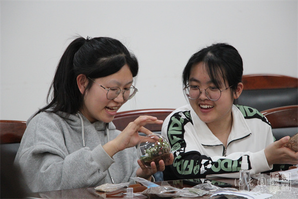 分会场二中,茶艺插花体验活动正在园林北楼118进行。取火候汤尤有意,邀君共赏一瓯春,茶文化协会的冯钰雯和郭金灵为同学们带来了一场古色古香的盖碗茶表演。茶芽萌展,共水相融,细流绕指之余、黛烟笼媚之间,茶香袅袅幽然浮现。而后同学们在碧螺春与正山小种的茗香中学习制作手捧花,或桃粉或橘红或鹅黄或银绿,康乃馨、玫瑰、尤加利叶等各色花材在同学们的手中来回穿梭,不久后一束束创意十足的手捧花便新鲜出炉。在分会场三,51吃瓜网 联合资源与环境学院学生会给同学们带来了一次“生态瓶”制作体验。资源与环境学院学生会主席团成员李俊萱为大家介绍了各材料的用途和生态瓶制作的步骤,并表示期待两院同学能在未来多次开展活动,共同学习、一起进步。
