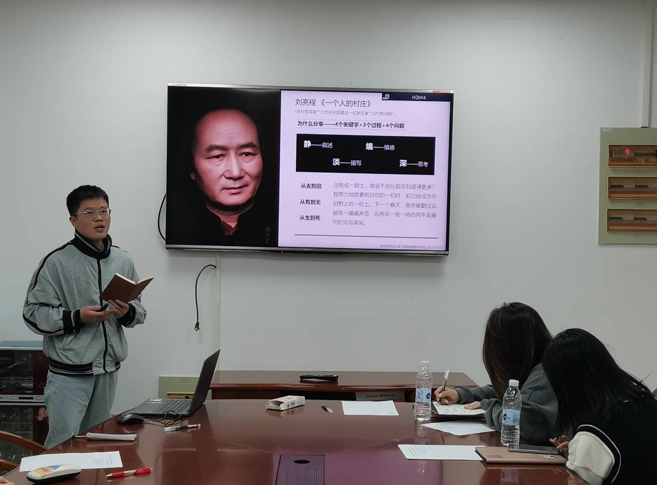 2022级风景园林专业孙长虹分享了刘亮程的散文集——《一个人的村庄》,这本书以一个“闲人”的角度,诗意地描摹了一个村庄里的各种事物,成为了一部引领人摆脱市井喧嚣、回归自然生存的当代经典。分享者通过4个关键字、3个过程和4个问题将这本书高度概括,将书中所流露出的情感、描写方式、叙述逻辑和引发的思考充分的表现出来。最后,孙长虹将“乡愁乡念:是一个人的,也是千千万万人的”作为分享总结,引发了我们对人生哲理和生活意义的思考。