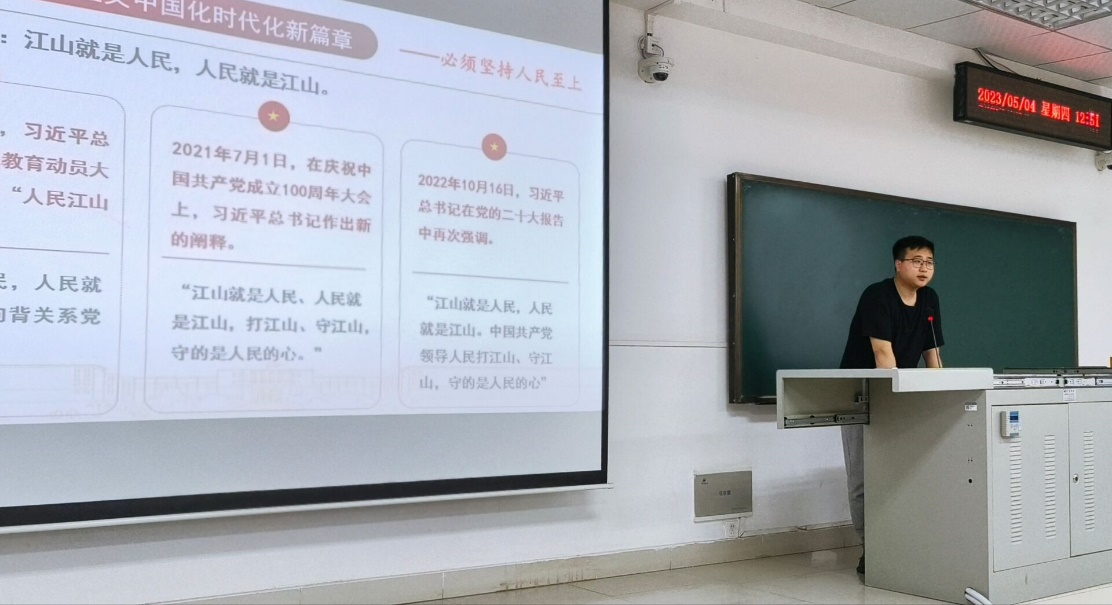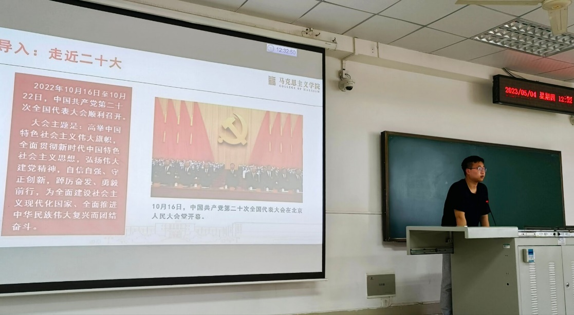 为进一步贯彻党的二十大精神,5月4日中午,学院在三教B205开展主题为“持续推进马克思主义中国化时代化”的党的二十大精神宣讲活动,学校“精读精讲”宣讲团成员、马克思主义学院研究生薛盘龙为2020级本科生进行宣讲。