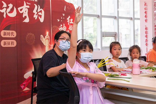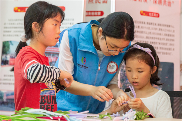 扭扭花束制作讲解开始后,看着讲解员姐姐将扭扭棒左扭扭右绕绕,轻轻松松地制作出一朵可爱的花,不少小朋友跃跃欲试,“是这样做的吗?”,“姐姐再教我一遍吧!”,他们在志愿者耐心的协助下渐渐熟悉步骤。