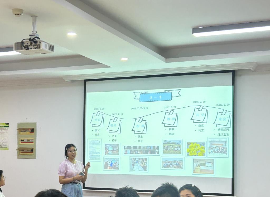 风景园林专硕2班学班蔡溪以时间轴“开启-初见-相遇-相识-共话-未完”分享自己一年的感悟与成长,在第二学期,她主持的开学第一课邀请每位同学为自己写便利贴,写下自己一学期的感受及后续计划,两年后归还给大家,记录大家的想法与进步。最后借用毕业典礼上高书记对毕业生的寄语,祝福在座的大家学习工作如虎添翼,展翅高飞!