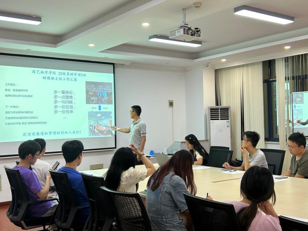 果树学硕2班学班刘胜军、蒋政华从个人发展、工作重点及下一步目标进行汇报,他们表示,下一步将组织与带动班级内部活动,开展不同的班集体组织交流形式,积极发挥学班-班委-班级的传帮带效应。