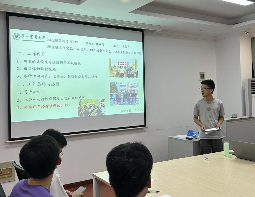 果树专硕2班学班刘海强从助理班主任定位及工作内容进行了具体阐述。他表示,机会总是打扮成困难出现在我们面前,无论科研还是生活,都要勇于表达善于表达。