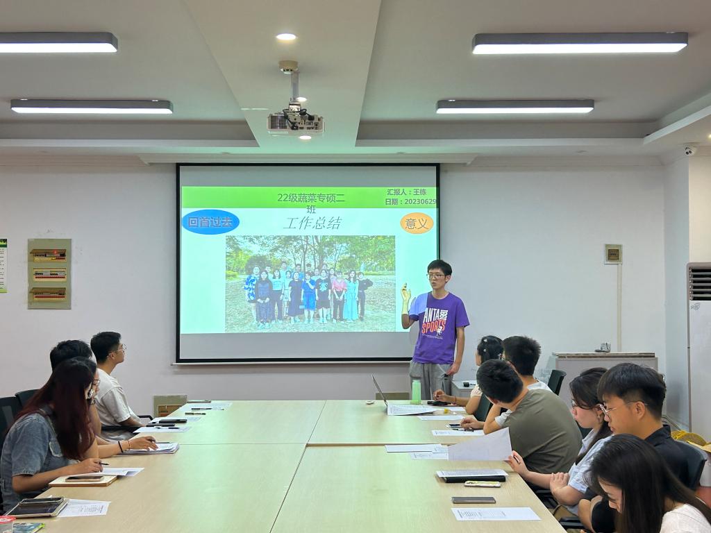 蔬菜学硕班学班张晨辉、专硕2班学班王栋分别从上、下两学期工作内容及个人收获展开汇报,两人表示,第二学期因为个人实验繁忙、科研压力等未与班级的每一位同学都进行一对一的谈话,很多创新的idea没有落实下去,希望在接下来的学年可以抽出更多时间和同学们交流,深入了解他们的动态。