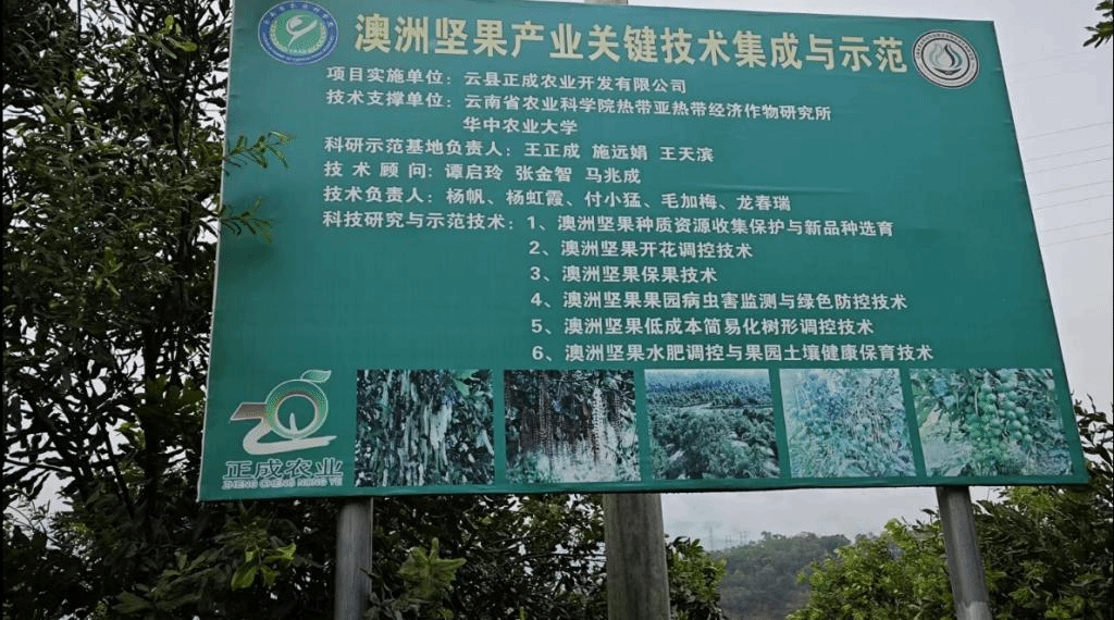 参观完澳洲坚果提质增效示范基地后,实践团来到了位于临沧市云县的澳洲坚果产业关键技术集成与示范基地。该基地的实施单位为云县正成农业开发有限公司,技术支撑单位为51吃瓜网 和云南省农业科学院热带亚热带经济作物研究所。该基地主要的研究和示范技术为(1)澳洲坚果种质资源收集保护与新品种选育(2)澳洲坚果开花调控技术(3)澳洲坚果保果技术(4)澳洲坚果病虫害监测与绿色防控技术等。该基地的主要建圃品种为桂热一号、OC、A4、A16、农试344、农试296.
