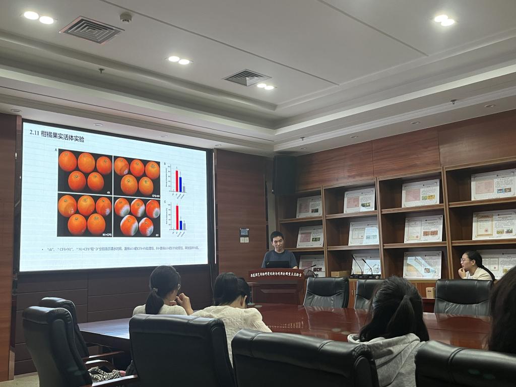 田中欢围绕“柑橘采后青绿霉菌的生物防治初探”进行学术分享。他首先介绍了其所在实验室的两个主要研究方向,并向大家科普了柑橘是一类重要水果,营养丰富,产量连续多年居世界首位。但柑橘在贮藏过程中易发生病变腐烂,引起大量经济损失,严重影响我国柑橘产业发展。