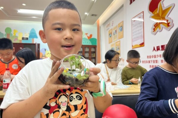 在此之后,来自园艺2101班的志愿者何欣欣带领小朋友们体验生态瓶的制作。小小生态瓶,蕴含大自然,从储水层到植被层都呈现着大自然的神奇与智慧。小朋友们跟随志愿者的讲解,认识了轻石、水苔、腐殖土等园艺材料,在志愿者的指导下将材料有序覆盖、平铺,小心翼翼种植小草,为选择最优种植位置而认真思考,用创造力与想象力构建出妙趣横生的植物小天地。生态瓶制作完毕后,一位小朋友开心地说:“这里面好像童话世界呀!我会好好爱护它,让小草健康长大!”