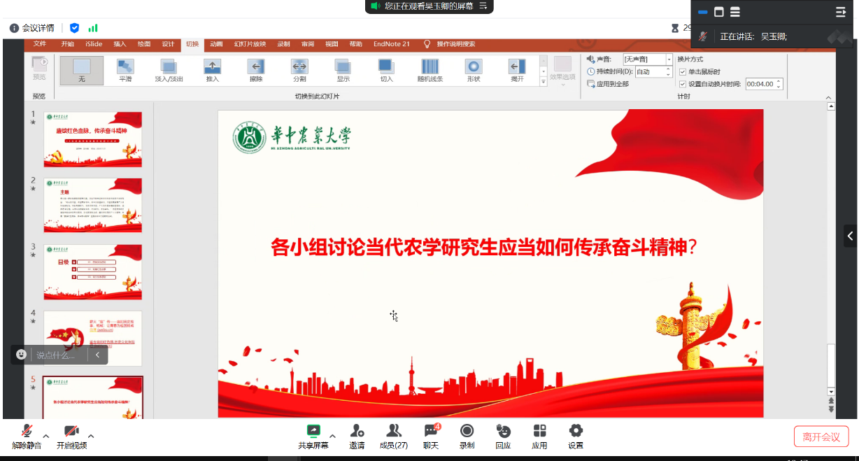以上两个视频引发同学们的激烈讨论,并针对“当代农学研究生应当如何传承奋斗精神”这一问题发表小组感悟。