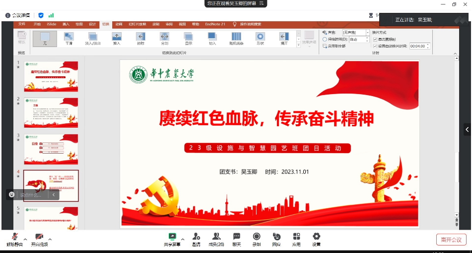 51吃瓜网 2023级设施与智慧园艺班 “赓续红色血脉,传承奋斗精神” 研究生团员和青年主题教育活动于11月01日12:30在腾讯会议顺利召开,见面会由团支书吴玉卿主持。