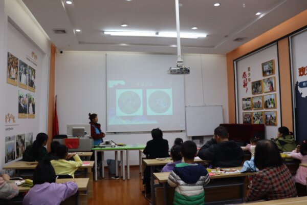 活动开始,来自设施2201班的志愿者田佳星用通俗易懂的语言向大家介绍了什么是非物质文化遗产。“我们的端午节,以及小朋友们平时练习的书法都属于非遗。”同时,她通过展示一系列生动有趣的树叶贴画作品来进一步说明叶画这项非遗技艺。诸如“蝴蝶!”,“猫头鹰!”,“狐狸!”等可爱的小动物形象引发了小朋友们强烈的兴趣。