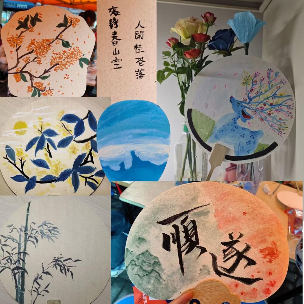 寒风习习无法阻挡同学们的参与激情。整体来看,团扇制作板块最受欢迎,桌子两侧坐满了参与的同学。大家运用画笔,在团扇上肆意挥洒颜料。在同学们手中,一副副印着奇绝山水、明艳鲜花、飘逸书法的扇面被创作出来。参与者在制作中受到中华优秀传统文化的熏陶,在绘画书法的艺术创作中感受自我,释怀压力。即使是不擅长绘画书法的同学也兴致勃勃,勇敢参与其中,大胆下笔,即使不甚完美,也能在制作完成后收获成就感。