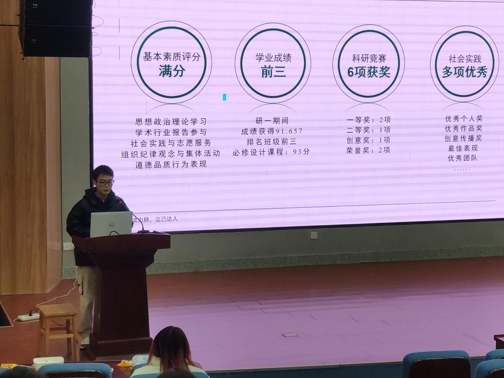 杨涛从“评审文件”、“科研学习”以及“公益事务”三个方面介绍其获奖心得。他强调,在评奖之前要根据细则有侧重的整理材料,实现努力与付出最大化的前提是自己的兴趣。他认为参与竞赛的过程当中充满挑战,但因为对竞赛本身充满了兴趣,自己才能够坚持不懈的完成一个又一个的竞赛并最终取得了自己满意的成绩。