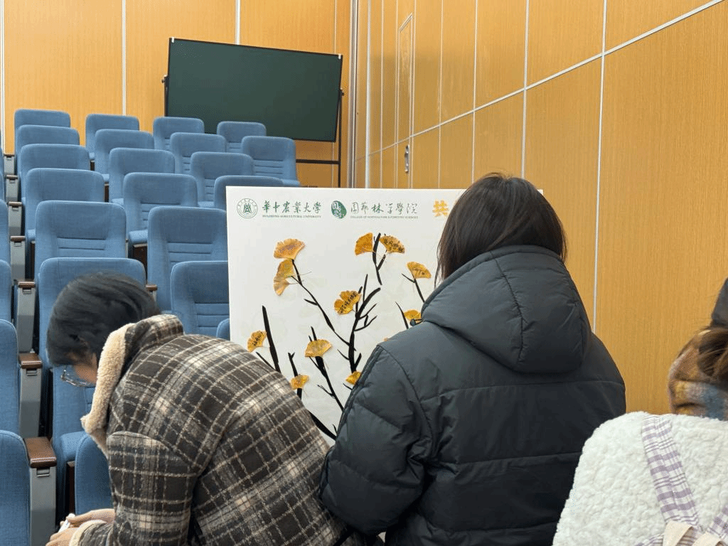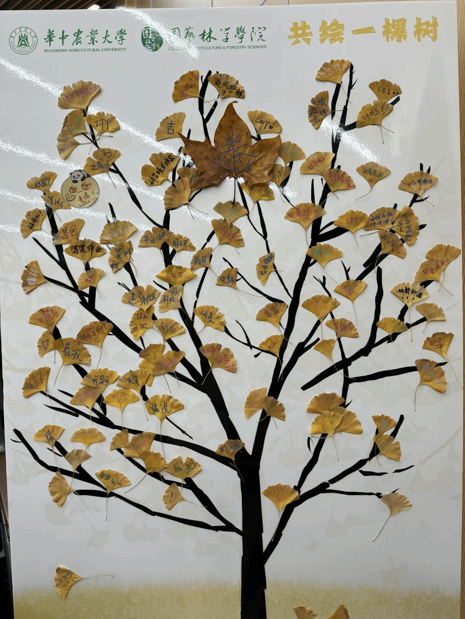 在最后的“共绘一棵树”环节,同学们用一片片金灿灿的银杏树叶记录自己在分享交流会上的所思所想,并最终将树叶贴在树干画板上,共同表达对风景园林专业的热爱和追求。