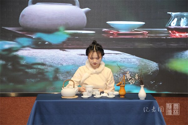 而后,茶学22级研究生王淑腾与冯钰雯合作献上了一场精彩的茶艺表演。王淑腾在烹茶的过程中,手法轻柔、流畅地操作茶具,有一种优美的节奏和动态美感,带领着在场的嘉宾感受着温暖、恬淡的心境。