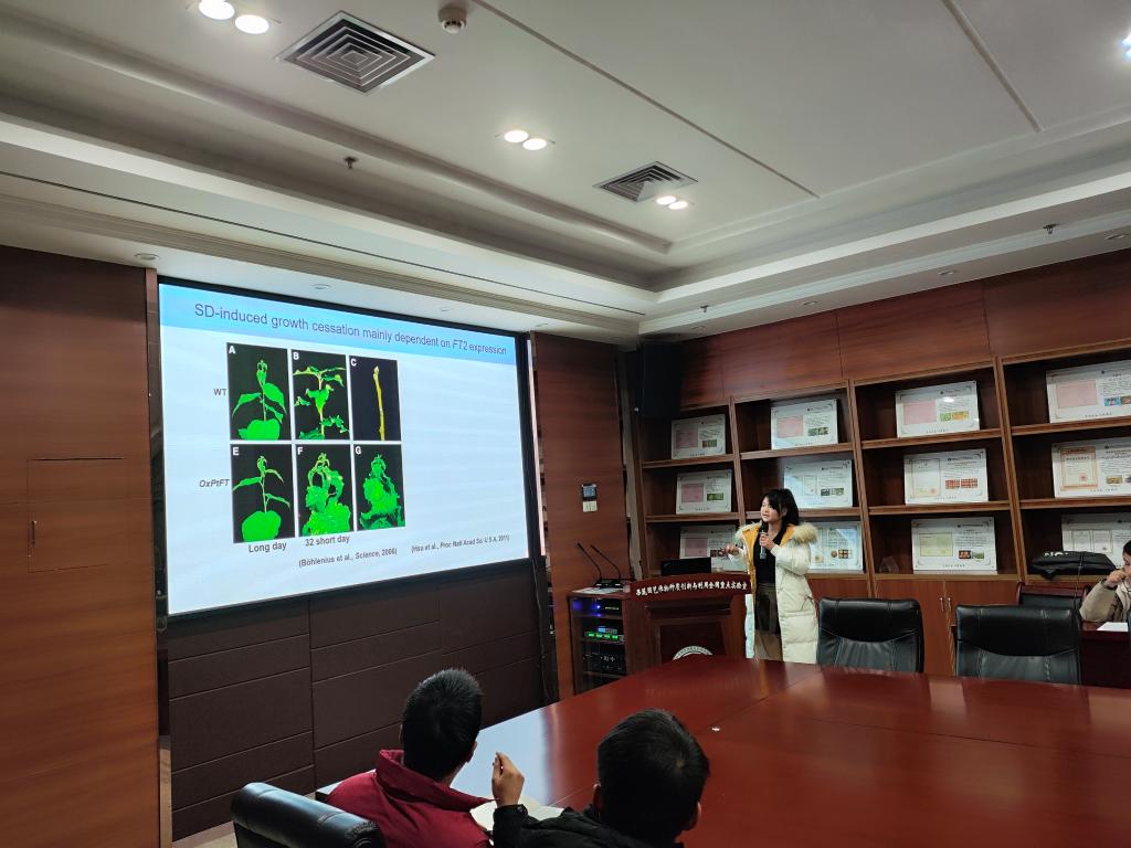 首先,廖晓利以“树木感知自身年龄信号调整物候期的机制研究”为题展开报告,她向大家介绍:该研究通过在田间和实验室对不同年龄树木季节性生长周期的观察以及统计分析,发现不同年龄的杨树在夏末秋初时生长停止的时间存在明显的差异。而遗传实验证明年龄调控关键因子miR156可促进杨树生长,通过抑制秋季生长停止与促进春季萌芽,有效的延长了杨树的生长期。进一步研究发现miR156通过调控不同的靶标基因来调控杨树季节性生长的不同发育时期,其中其靶标SPL3/5 clade基因在控制杨树生长停止中发挥关键作用。