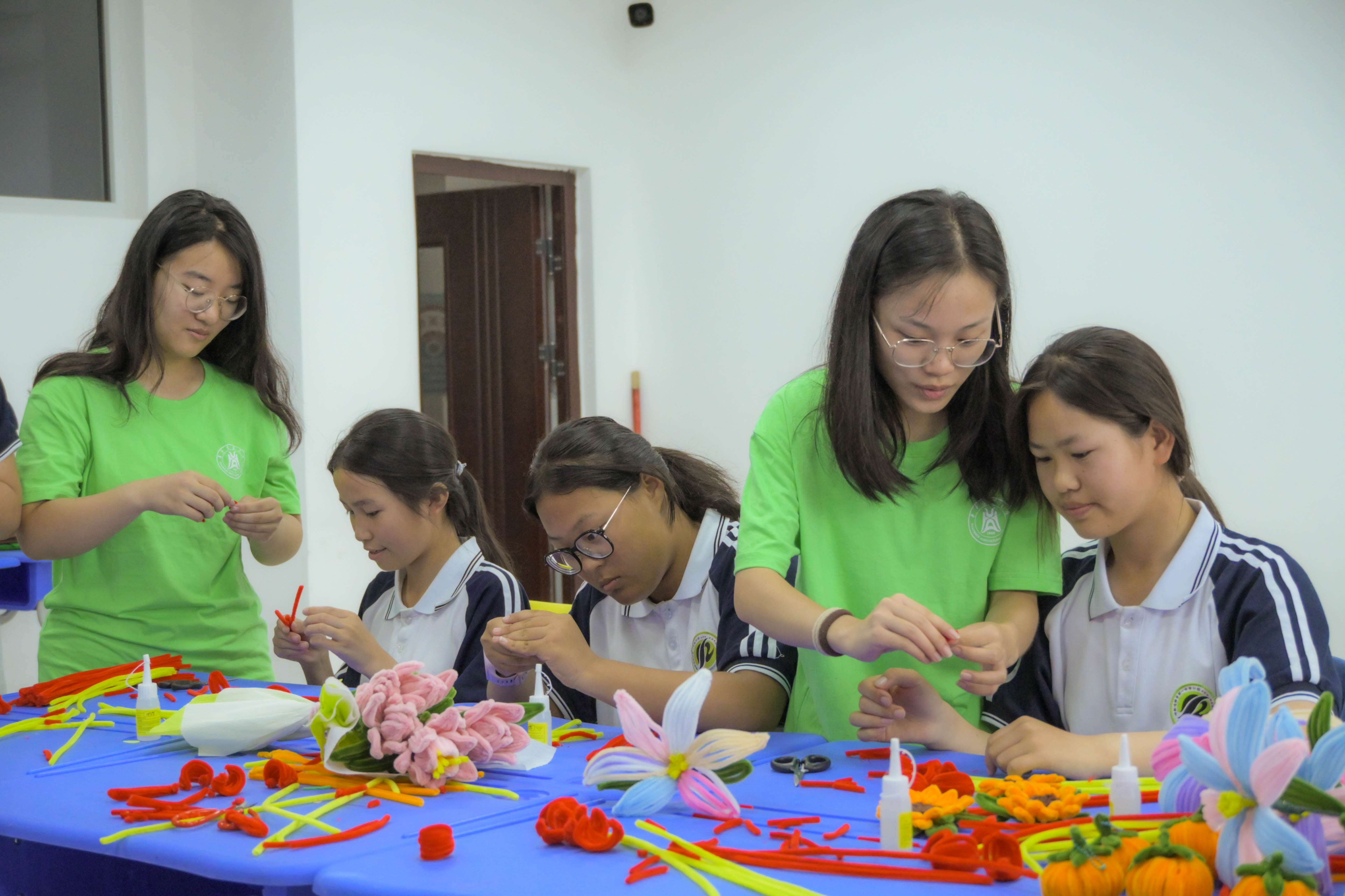 吴娜和董佳悦一起给孩子们带来了手工课,教同学们如何用皱纹纸和扭扭棒来创作自己的作品。从学习材料的基本使用方法,到自己熟练diy属于自己的创意作品,同学们上手的很快。皱纹纸画、南瓜 、花束、向日葵挂件……同学们制作出了许多漂亮又有创意的作品。志愿者们还带领同学们制作了同心结,希望中华民族五十六个民族同心同力,共同建设美丽中国。