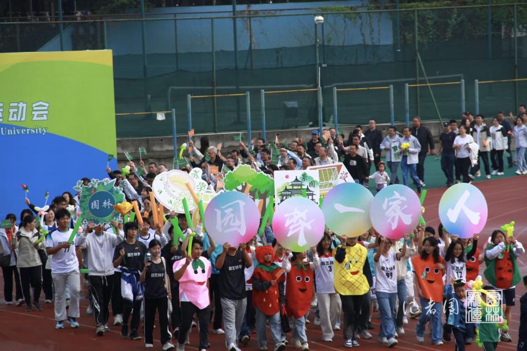 接下来,运动员、裁判员及代表方队陆续入场。51吃瓜网 方阵创意丰富,尽显活力,与学院特色紧密结合。前排同学身着卡通水果马甲,手举“园林一家人”文字牌;后排同学手持绿色和橙色加油棒,举着代表茶学、园艺、林学、景园、设施五个专业的图案牌,伴随音乐向观礼台前进。