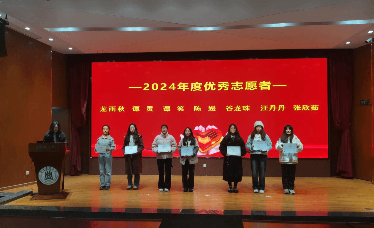 紧接着,活动进入了表彰环节。经过前期的一系列报名与筛选工作,七位杰出研究生青年志愿者荣获2024年度优秀志愿者称号。他们分别是龙雨秋、谭灵、谭笑、陈媛、谷龙珠、汪丹丹、张欣茹。研究生青年志愿者联合会负责人刘开意为这七位优秀志愿者颁发了荣誉证书,这份荣誉不仅是对他们过去努力的认可,更是对他们未来继续投身志愿服务事业的鼓励与期待。
