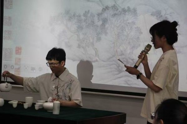 来到耕读茶室,茶学2201班赵诚和陈晓晓以一场行云流水的茶艺表演,展现了中华茶艺的优雅与深邃。从温杯烫盏到悬壶高冲,从茶汤品鉴到茶席礼仪,学生们以精湛技艺诠释了茶文化的深厚底蕴。华工科技赛百直属党支部成员在茶学系师生的指导下,亲手体验泡茶技艺,感受“一叶一世界”的东方哲学。