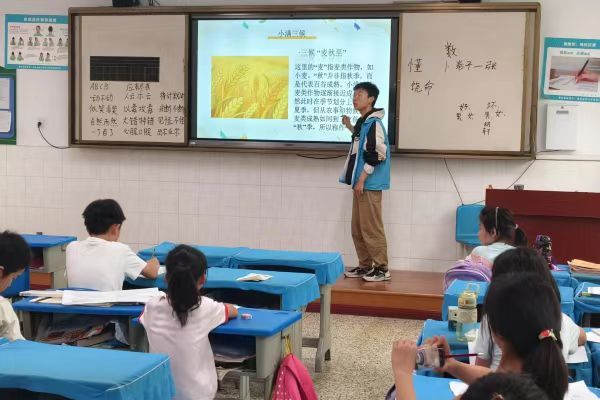 “大家知道最近是什么节气吗?"园林2401班的刘国富作为本次活动的小讲师首先抛出了一个这样的问题,互动式开场吸引了孩子们的注意力。小满,作为二十四节气之一,不仅是夏熟作物籽粒渐满的时节,还承载着万物生长美好愿景。"小麦宝宝此时正在咕嘟咕嘟地补充营养",他以生动的比喻指出小麦的生理状态,形象讲解小满三候特征。在阐释"江河渐满"的节气智慧时,他巧妙引出"生命成长需要养分滋养"的自然哲理。还以实际例子说明小满是“最惬意、最生机、最智慧”的四最节气,让孩子们在感知节气文化的同时也对小满产生了好感。