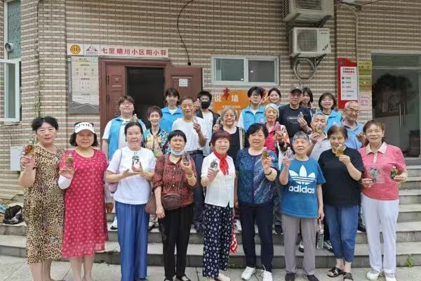 在“干花浮游瓶”的制作过程中,志愿者们分发玻璃瓶、永生花、镊子等工具,协助老人们制作干花浮游瓶。老人们将风干的玫瑰、雏菊与满天星等多种干花进行修剪,用镊子放入玻璃瓶内进行搭配。瓶内铺陈着的干花,在矿物油浸润下舒展开来,一个个独具创意的作品跃然呈现,七里晴川社区的陈奶奶表示:“以前总把香蕉塞冰箱,今天学了包保鲜膜的方法,还做了浮游瓶,既实用又好看!”兼具实用性与艺术性的设计,让科普活动从单向输出转变为沉浸式体验。老人们捧着亲手制作的浮游瓶合影,脸上洋溢着成就感。