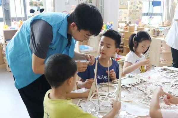 科普环节结束,小朋友们提着自己的小凳子,井然有序地来到桌前,好奇地观察着制作材料。本次活动也迎来了高潮,在志愿者和老师们的悉心帮助下,小朋友们细心地用胶水将花草纸粘在骨架上,耐心地组装花草灯,按下开关,花草灯亮起的那一刻,小朋友们都不禁发出了欢呼,眼中也满是喜悦的光芒。通过手工实践,小朋友们既体验到了创作的乐趣和成就感,又加深了对小满节气的理解,真切感受到这个时节草木葱茏、万物繁茂的自然生机。