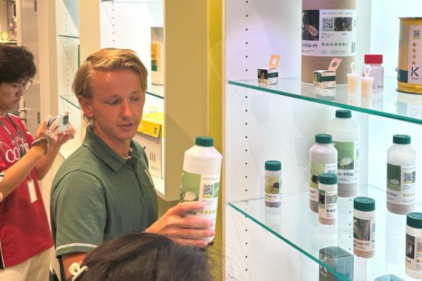 随后,大家来到理念展示区,“We partner with nature”“We work for growers” 等标语,搭配生动的实际案例,传递出企业秉持生态友好理念、助力农业种植发展的深刻内涵,引发学生对农业企业社会责任与发展方向的思考。而在生物防治技术展示区域,Koppert讲解员David Rossiter重点介绍了熊蜂等昆虫在生物防治中的应用。透过展示容器,学生们清晰看到熊蜂的生活状态、蜂巢结构,结合讲解员对生物防治原理、优势及实际应用场景的阐释,原本停留在课本上的理论知识,变得鲜活可触,让大家对生物防治技术在农业生产中如何替代化学防治、实现绿色种植,有了切实且直观的认知 。