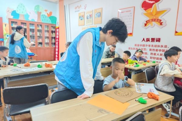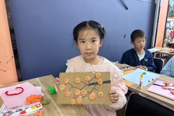 在科普霜降传统习俗时,程越重点介绍了霜降赏菊与吃柿子的习俗,还特意为孩子们揭秘了柿子变甜的原因。而最受小朋友期待的,当属手工创作环节——制作霜降柿子图。孩子们拿起工具,充分发挥想象力,有的用黏土捏出圆滚滚的柿子,有的用画笔勾勒枝叶,还有的小心翼翼地撒上“霜”,为作品增添上霜降的“专属元素”,在动手实践中收获属于自己的“深秋甜蜜”。制作过程中,志愿者全程关注小朋友安全,提醒大家勿误食黏土、安全使用胶水。