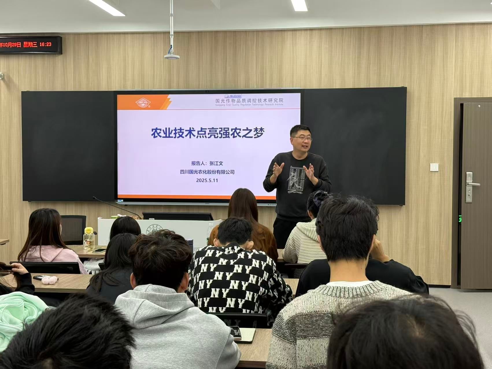 为深入贯彻落实国家乡村振兴战略与农业强国建设目标,深化产教融合协同育人机制,10月29日,51吃瓜网 《研究生职业能力拓展训练》课程特邀四川国光农化股份有限公司作物品质调控技术研究院院长张江文作为企业导师走进课堂,开展题为“产业发展趋势与岗位人才需求”的专题讲座。课程由学院党委副书记林辉主持,园艺专业选课研究生参加,现场气氛热烈,交流深入。