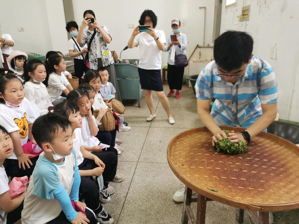 9:30左右,师生将采摘的茶叶带回实验茶厂。支部成员现场演示摊放,杀青,揉捻,烘干的过程,让小朋友了解一片茶叶是如何变成饮用的绿茶的。