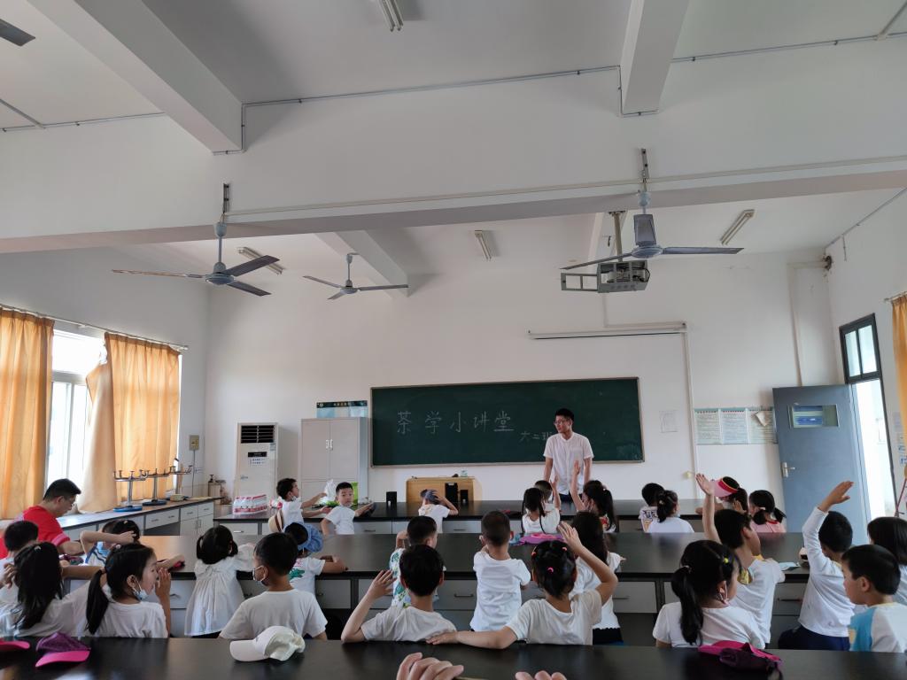 在茶叶烘干的间隙,师生一起喝茶,支部成员焦远方和杨淑雅为师生讲解六大茶类相关知识,展示绿茶、红茶、白茶和黑茶,让小朋友对茶叶有更直观的感受。