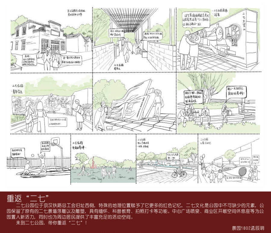 “这是一个怎样的世界?“景园1802班的孙长虹在调研之后产生了这样的思考。在他的作品《二七公园的一天》中,红色与蓝色交织,通过一天不同的时间点串联起二七公园不同的活动空间以及人在空间中不同的行为心理。孙长虹谈道:”二七公园具有十分厚重的革命历史底蕴,它与京汉铁路大罢工这一历史事件密切相关,所以我希望能够通过对二七公园的更新改造设计重新塑造城市居民的精神之所,让人们在公园中可以充分感受到革命的奋斗精神,铭记历史和革命先烈的无私奉献。“景园1801班的吴兆天通过对二七公园走访调查,在全天实地观察人群游憩活动行为后,从各时段人群游憩行为中选取了六种比较典型的行为进行了记录与感知描绘。作品《重返“二七”》是景园1802班孟辰玥的作品,她用细腻的笔触描绘了人们在二七公园的行为活动。
