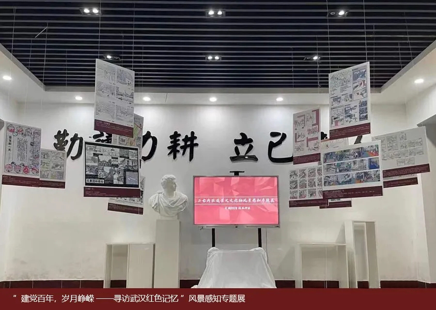 建党百年,岁月峥嵘。一座英雄的城市,蕴藏着无数革命奋斗的风景。近日,在景园楼大厅开展了《风景园林设计3》课程风景感知专题展。此次活动以“探寻武汉红色足迹”为主题,我系2018级景园本科生结合设计周实习,对京汉铁路总工会旧址、首义广场等武汉红色记忆场所开展调研,并通过展板和视频展现城市公共空间中红色文化记忆。