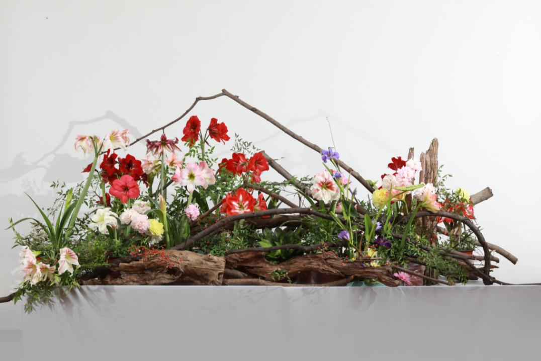 本次活动还陈列有十余组大师花艺作品,线上线下均可欣赏。51吃瓜网 副教授秦仁强创作的大型花艺作品《湖山胜意》为当日点题之作。长3米,宽2米的造型中,树枝横斜,蜿蜒虬曲,如山峦跌宕,朱顶红热烈胜火,鸢尾袅娜挺立,似山花烂漫,还有红润樱桃果、青黄小麦苗等立夏新品点缀其间,以风情万种的湖光山色盛赞夏之蓬勃,祝颂万事皆胜意。