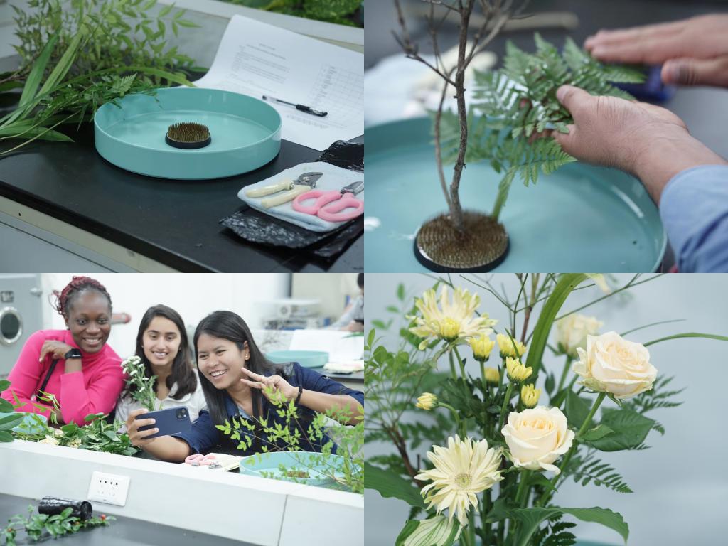 首先,王媛媛老师使用中英双语对东方传统插花的风格和特点进行了讲解,她表示,“中国是东方传统插花艺术的起源地。东方插花崇尚自然之真,赋予人文之善,追求艺术之美,体现圣洁之尊。”在“真、善、美、圣”的体悟中,留学生们了解了东方插花艺术的深刻寓意和深远意境。