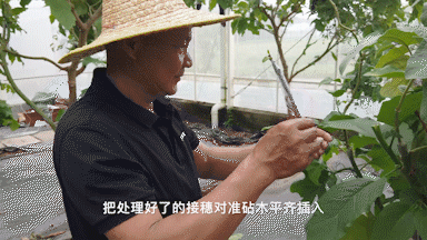 “这就是茄子的接穗,上面缠薄膜是为了锁住水分。”叶自文一边说着,一边带记者来到一棵茄树前。只见他从衣兜里掏出美工刀,像削铅笔一样,将接穗底部削出两三公分长的楔形,然后剖开树上一根绿茎,熟练地把接穗插进去,最后用透明薄膜将嫁接处缠好。