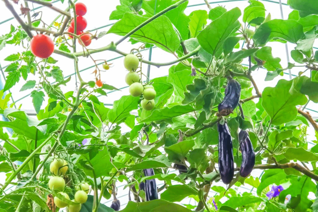 “树上不仅长茄子,还可以嫁接很多作物。”头戴草帽的大棚管理人叶自文师傅,利落地用高枝剪剪下一串红色的小番茄和三个茄子。