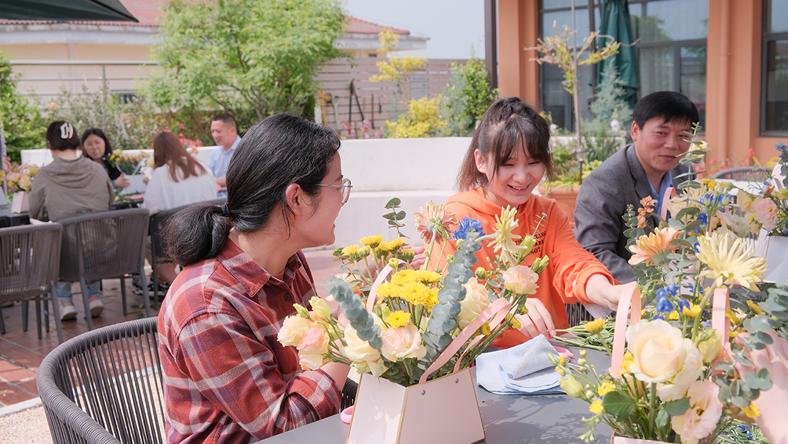 活动的高潮部分为康养插花体验环节,由愈见花艺工作室创始人杨雪带领示范插花过程,由文法学院陈红莉老师专业引领小组讨论。参与者们亲手制作花艺作品,在实践中进一步了解康养园艺的疗愈过程,此环节不仅增进了参与者的互动,也使他们能够暂时放下日常的工作压力,享受一段难得的静心时光。