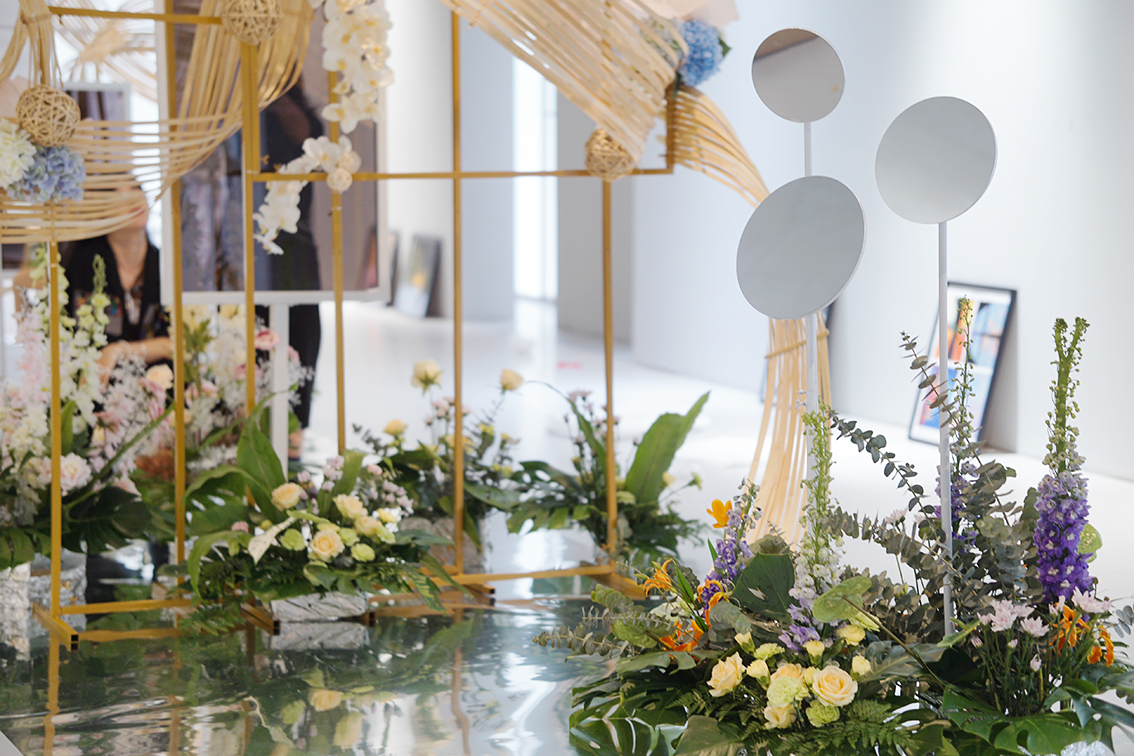 展览主展厅中心的花艺装置设计由愈见花艺工作室的师生和栖息公益联合设计。其中植物生命力象征社会联系,单双面镜反射自我与情感,提示人类情感与思绪同等重要。该作品引发观众对心灵和自我探索的思考——活着的关键在于如何生活、自我认知与他人接纳。