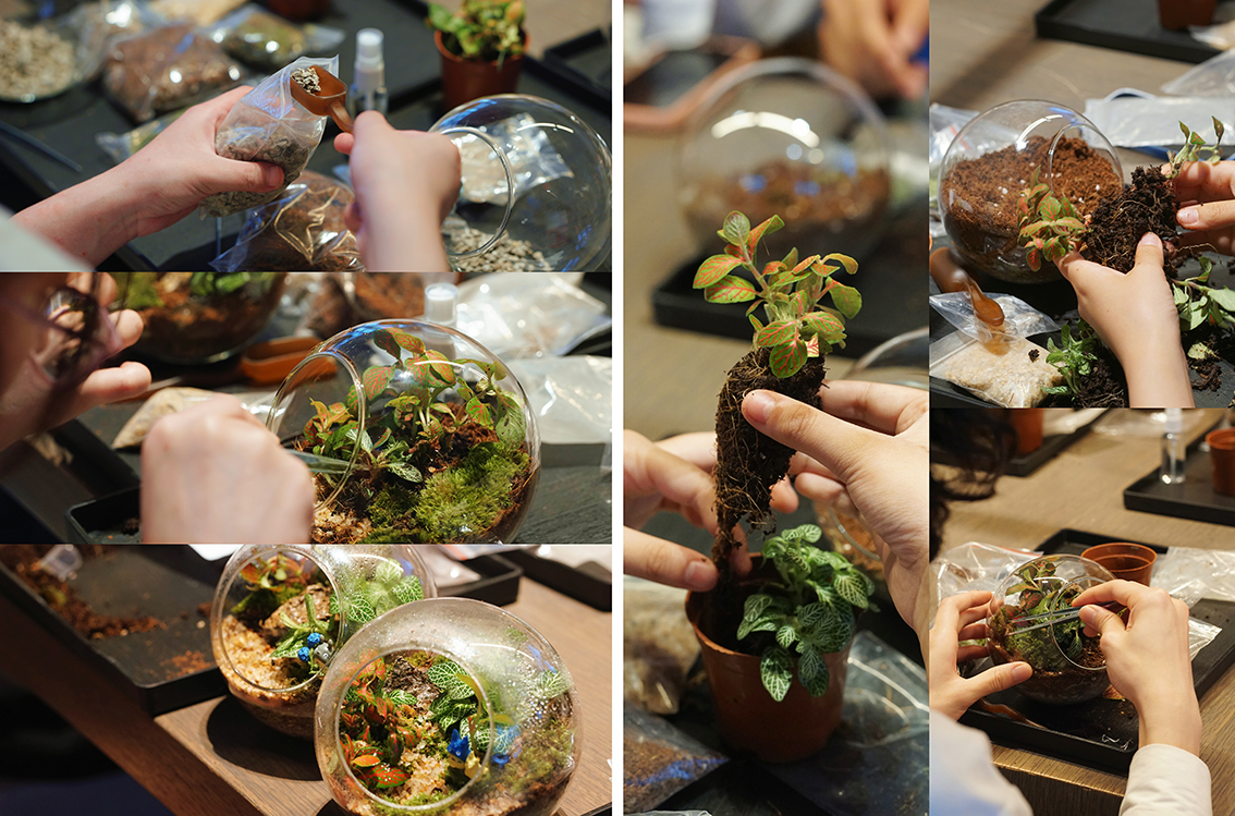 除了展览作品外,愈见工作室还于当天下午组织开展园艺生态瓶制作体验活动。参与者们在主讲人杨雪的指导下,亲自动手制作瓶中微型花园,用双手触摸植物叶片、土壤和碎石。不仅体验到了种植的感官乐趣也收获了植物的养护技巧,感受亲自然带来的愉悦与放松。
