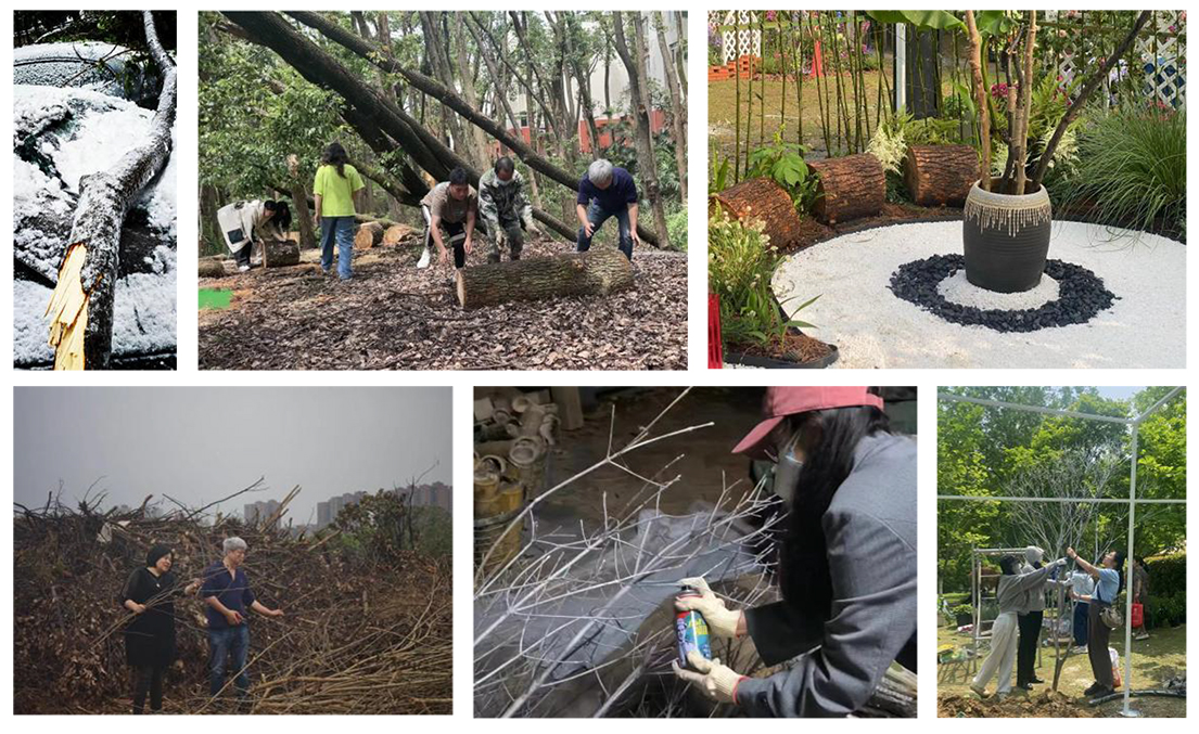花园的主体材料为武汉去年冻雨后被损坏和断裂的各种树枝,师生共同在废弃枯枝堆放处拾捡大量枯枝断树,并手工处理成为花园户外家具和艺术品,以此进一步反思极端气候下自然灾害的影响,从而以重建和再利用的方式实现“韧性景观”的创作实践。