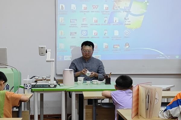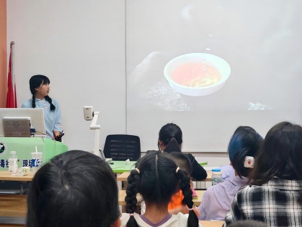 活动伊始,志愿者鲁锦毓为社区小朋友与家长们进行小满节气传统文化科普,介绍了小满节气在南北方不同的含义,并引出小满饮茶的习俗,特别对习俗的由来进行细致解释。小满节气正处春夏之交,气温上升,降水增多,民谚云:“小满小满,江河渐满。”可见此时天气潮湿闷热,身体易发热乏力,嗜睡,食欲不振。饮茶能够帮助我们除湿热,缓解身体乏力,保持轻松愉悦的心情。科普期间,志愿者邀请小朋友和家长们分享日常生活中的饮茶经历,小朋友们踊跃回答:“绿茶”“乌龙茶”……志愿者结合小朋友们的答案将茶的分类知识引入课堂,将颜色、发酵程度、凋萎程度等茶叶分类的标准徐徐道来。紧接着,志愿者向亲子家庭介绍了适合夏季饮用的茶类,科学的饮茶方法,不同的人群对应不同的饮茶方法,以便更好地发挥茶的功效。