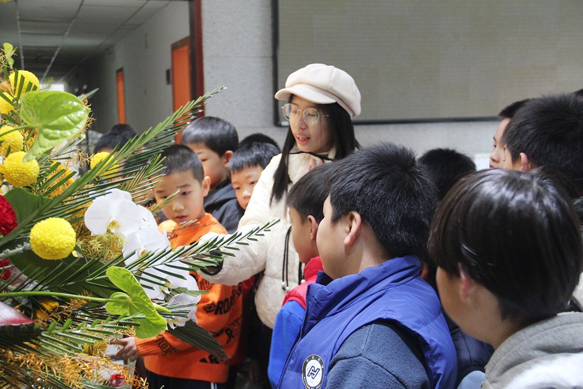 楼道里插花艺术作品分为指定主题“诗意颂中华”以及指定类型展,共50件作品整齐排列在学院二楼大厅及楼道里。小朋友们看到花卉及园林植物种类多,颜色搭配好看,与身边的同学逐一探讨插花作品,不时拍个照片,觉得每个作品名称富有诗意文化气息。尤其与花卉搭配的小动物们与作品形成完美结合,小朋友们流连忘返,不时发出惊叹。