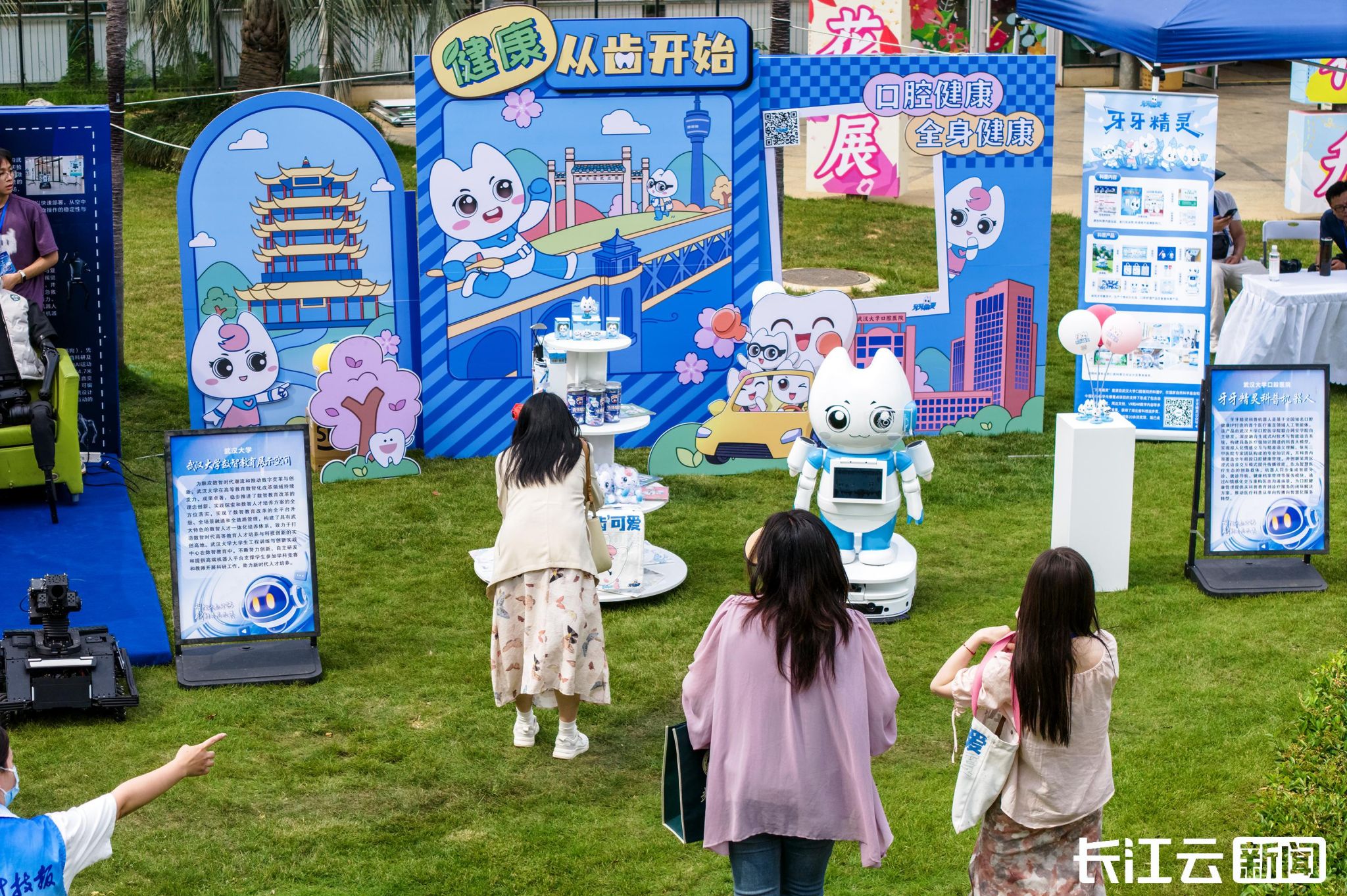 线下亮宝展位附近,23个单位组成的科创集市热闹非凡。潜江芝麻科技小院的蓝莓酒、秭归脐橙科技小院的秭归脐橙展现了乡村振兴成果;武汉轻工大学让古今榨油工艺产品同框对话。AR笔记本、AI编程拼图、口腔科普机器人等数智文创吸引青少年组团挑战和体验。